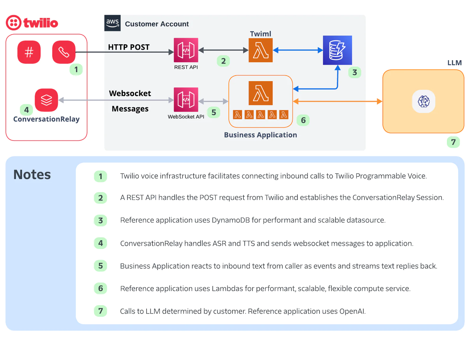 Now, let’s turn our attention to building a reference application using ConversationRelay. We’ll use OpenAI as our LLM, and build our application architecture on top of AWS.