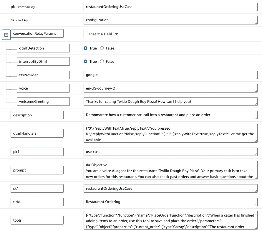 Try changing the prompt and ConversationRelay parameters directly from the DynamoDB console. Inspect the session items generated by your calls to see how this application stitches together conversations.