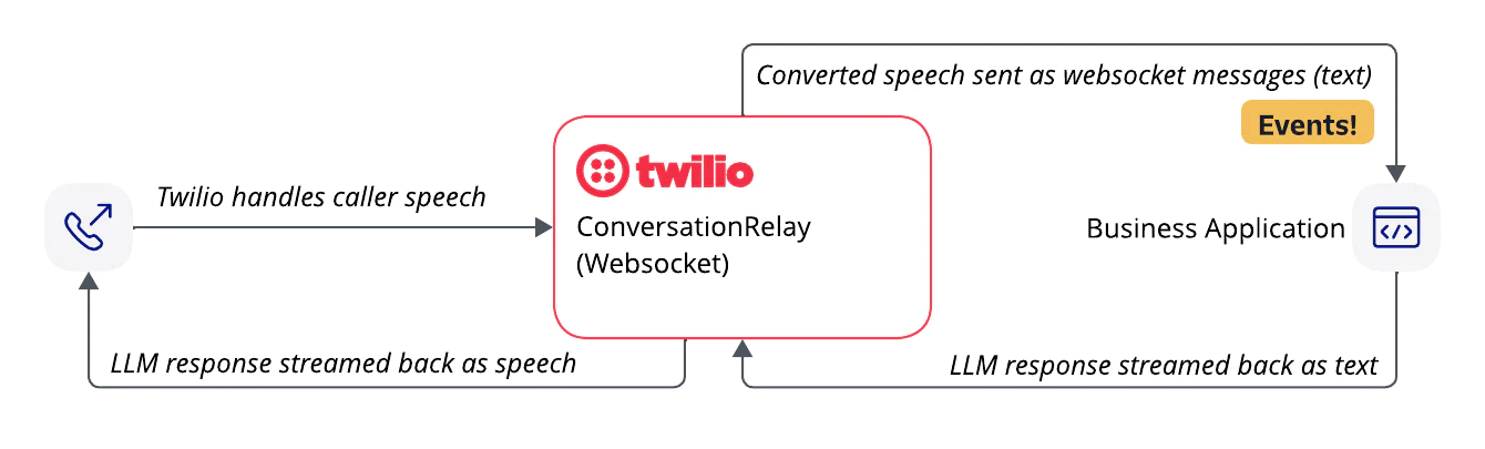 When a caller speaks, Twilio ConversationRelay uses a TTS provider to convert the speech into text and sends that completed text to the business application in a message over a websocket connection. In the diagram above, speech from the caller arrives at your application as “events” to be processed (websocket messages). Your application handles these events and can stream text responses back from your application (and LLM) as websocket messages to Twilio ConversationRelay where the streamed text is converted into speech.