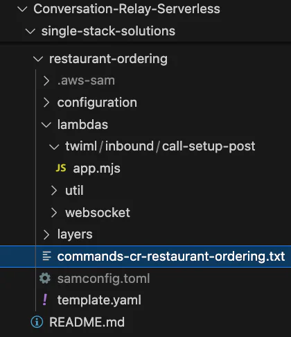 The repo contains everything needed to deploy multiple solutions. Again, this blog post is going to spin up the restaurant-ordering app in the single-stack-solutions folder so navigate there first. Here is the correct location in my IDE: