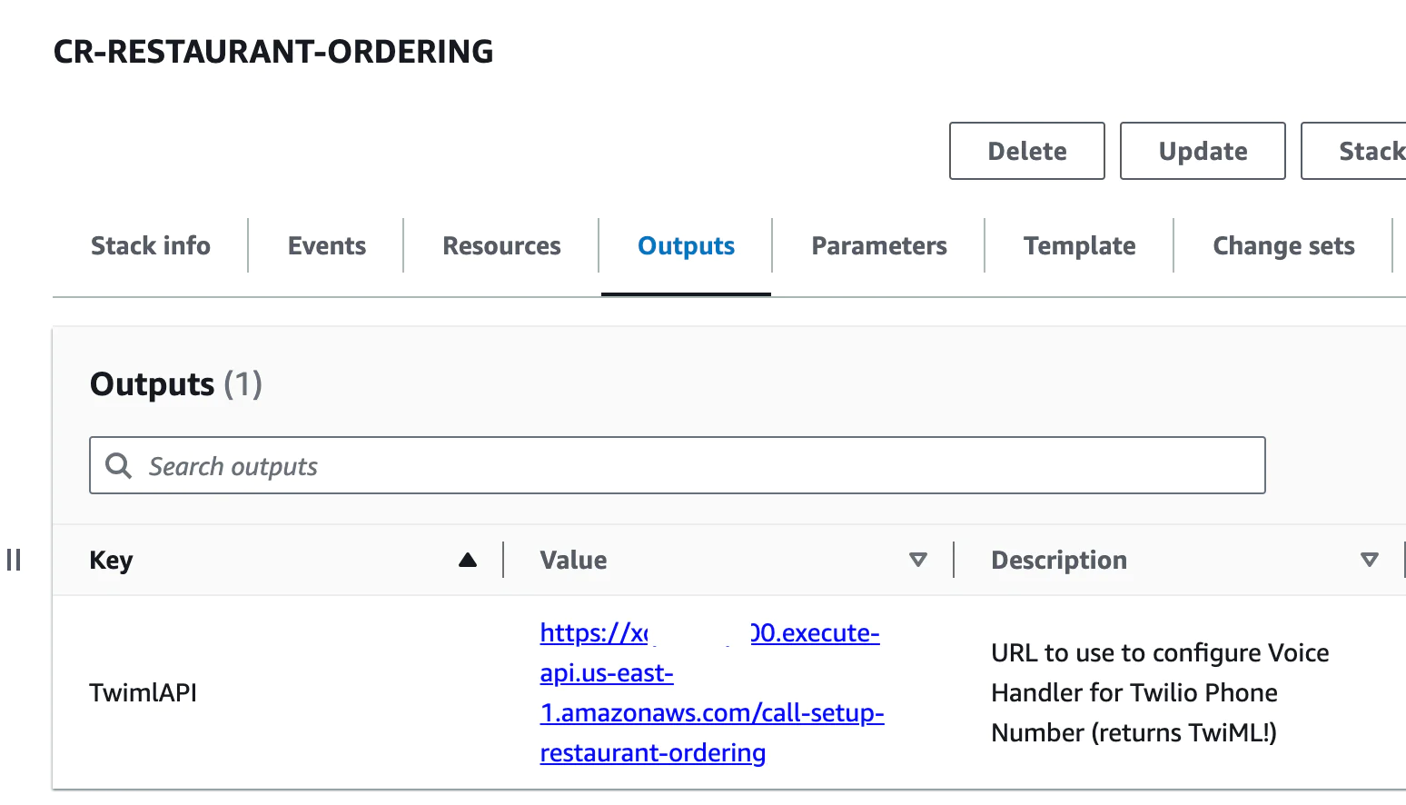 Click into that stack and then go into the Outputs tab and copy the value for TwimlAPI as you will need it in the next step! It should look like this: