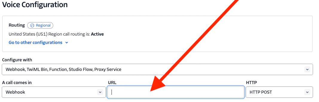 With the value copied from the previous step, go to your Twilio Console and navigate to the phone number that you want to use for this application. In the Voice Handler section under A call comes in, select webhook and then paste in the value copied above to connect your Twilio phone number to the application you just spun up.
