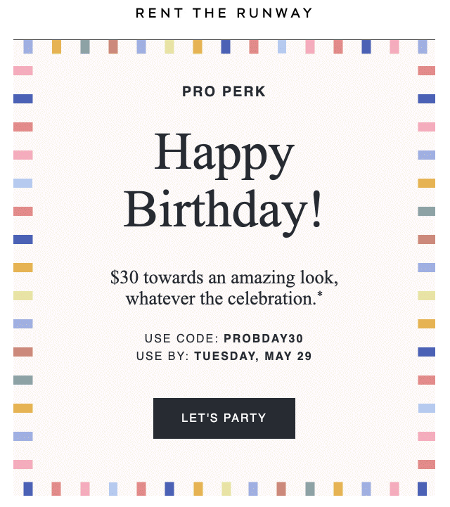 Rent the Runway keeps it simple in its happy birthday email with fun colors, quick copy, and a steal of a deal.