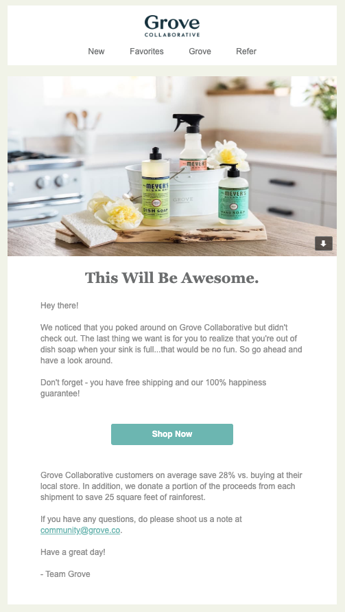 Grove, an eco-friendly home essentials company, does an excellent job of walking the line of the abandoned cart email. With the subject line, “Thanks for checking us out!” and the gentle nudge to get you to act before running out of dish soap, this feels like a friend sending a reminder email rather than a push to sell.