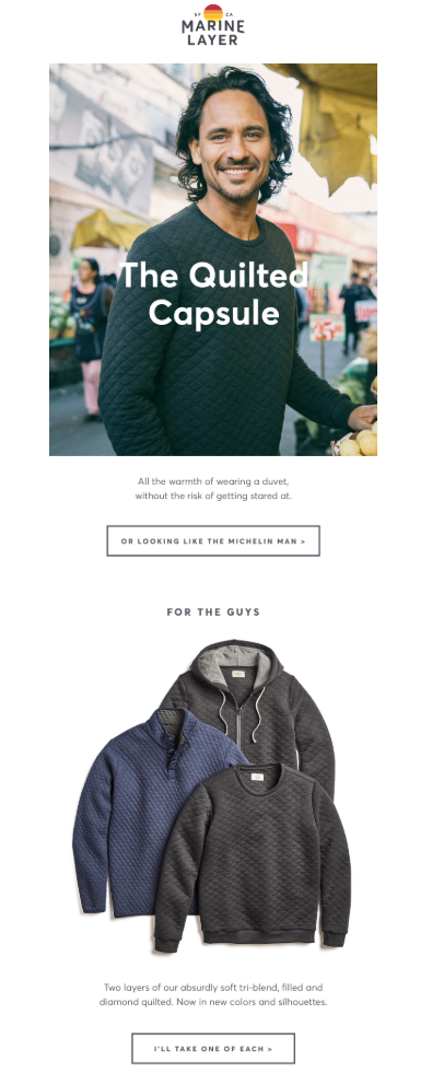 Marine Layer leveraged the particularly snowy weeks in the Midwest this winter by sending an email with the subject line, “Quilts to get you through this cold spell.” The cold-spell theme isn’t just thrown into the subject line but also woven throughout the email to create a consistent, personalized message.