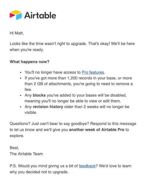 This email from Airtable, a database and spreadsheet SaaS company, may not have the flashy design of some of the other emails in this post. But it does a great job of highlighting what is (or isn’t) offered in Matt’s account now that his trial is over.