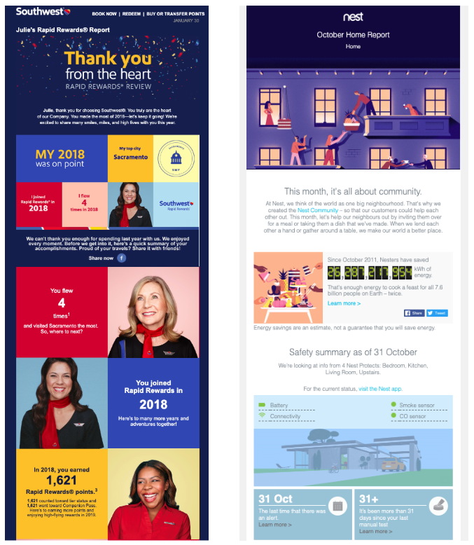 If you think it would be useful to your recipients, a monthly recap campaign is another great way to connect with users continually. Nest, a manufacturer of smart home products, offers its customers monthly recap emails with information like the last home alert, the last time you performed a manual test on your product, and your energy consumption for the month. What’s neat about this type of email is that you can compare month to month and see how you improve throughout the year.
