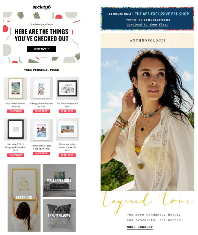 After I browsed Society6’s website a few times for art pieces to create my dreamed-of gallery wall, Society6 sent me an email with several of the items that I checked out over a couple of weeks. This is a great way to remind recipients of the items they’ve viewed the most and might still want.