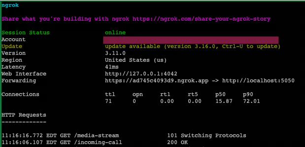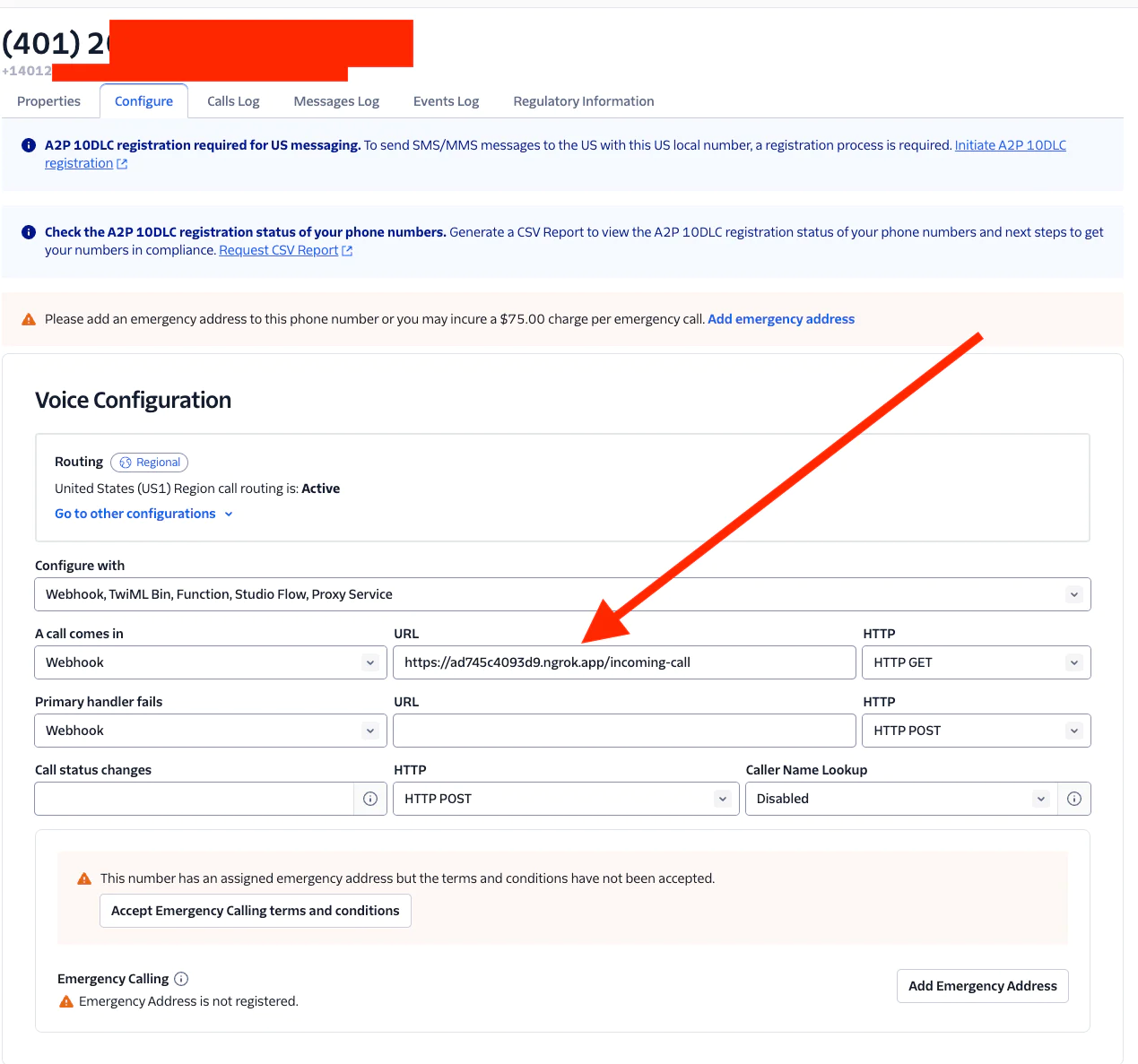 Under Voice & Fax on that screen, set the A CALL COMES IN webhook to your ngrok URL (in the Forwarding line, ( https://ad745c4093d9.ngrok.app in my screenshot) appending /incoming-call. For example, in my case, I enter https://ad745c4093d9.ngrok.app/incoming-call.