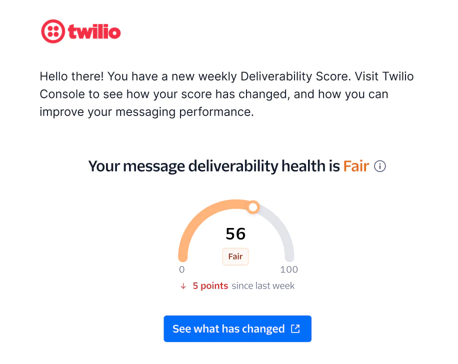 The [Deliverability Score] provides a simple, comprehensive view of your messaging traffic and helps you target specific areas for improvement. The new weekly email summarizes your score and provides links to Twilio Console Messaging Insights where you can view score details, identify optimizations, and troubleshoot.