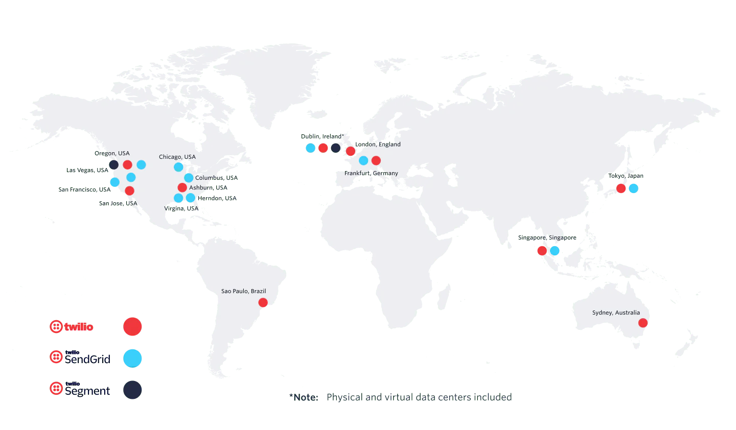Twilio’s hybrid infrastructure combines the cloud with our data centers. You can choose to process your workloads in the data center closest to your consumers for the fastest and most reliable connection.