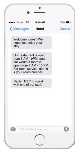 SMS is the perfect channel to send automated messages to your guests to answer any questions they may have about their reservation. Once a guest checks in, you can send them information about your hotel’s restaurant menu, gym and pool hours, nearby transportation, and room service options. By sending automated texts answering your guests’ frequently asked questions, you can save time and energy and free up your staff to address higher priority issues.