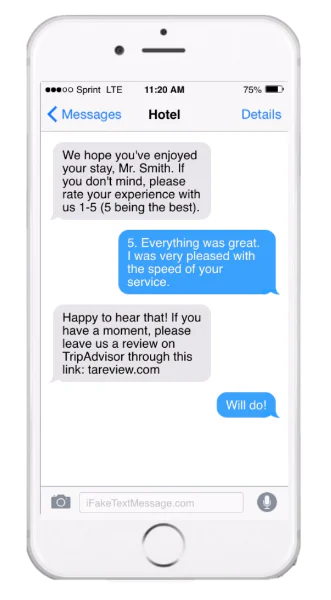 After your guest completes their visit, use SMS to get instant feedback about their experience. Guests can complete quick surveys and respond to questions directly through SMS, making it easy for you to gather customer feedback and learn how to better improve your guests’ experience.