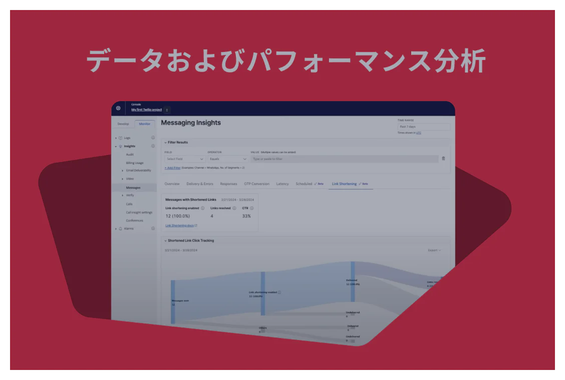 開発の簡素化、市場投入の迅速化、高い配信率を実現します。**メッセージのスケジューリング、クリックトラッキング付きリンク短縮、高度なデータ、リアルタイムダッシュボードがどのようにビジネスに役立つかをご覧ください。